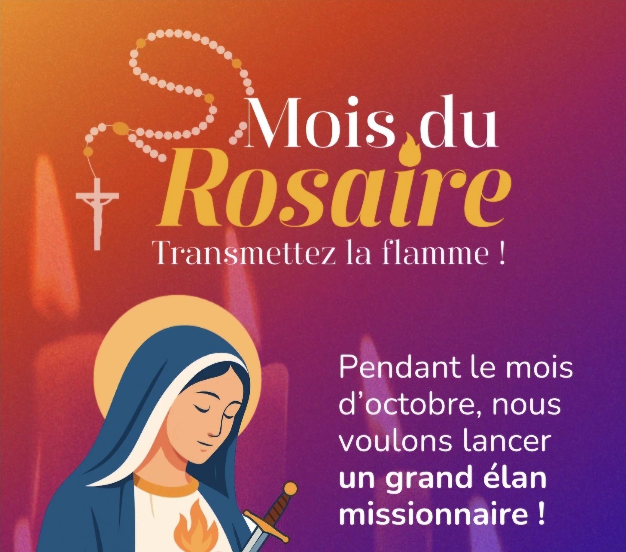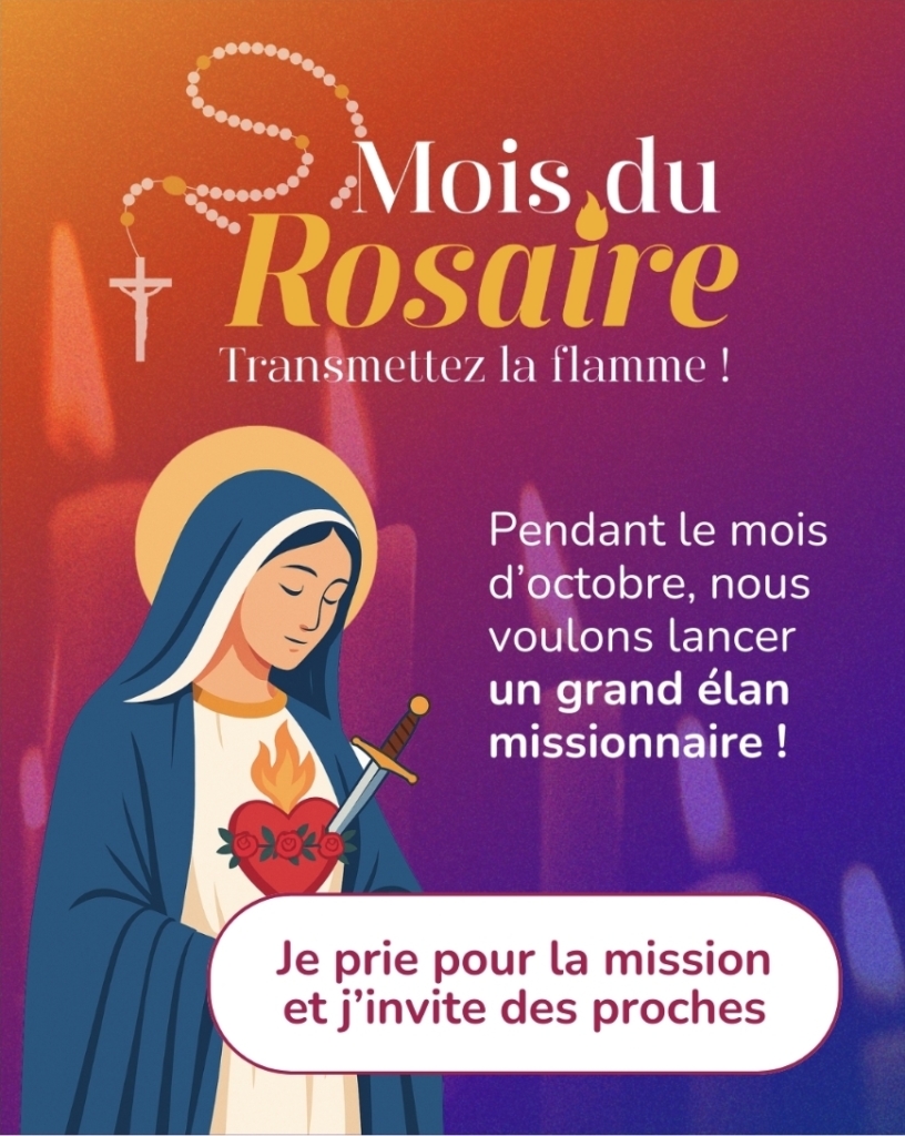 En ce mois d’octobre, dédié à la prière du Rosaire, chaque paroissien est invité à rejoindre un groupe de 5 priants de la paroisse sur l’application Rosario, gratuite. Entrez le code d’invitation 0170541, ou recherchez notre paroisse sur l’application. Chaque jour, priez une dizaine du chapelet ; à cinq, le chapelet est récité quotidiennement.